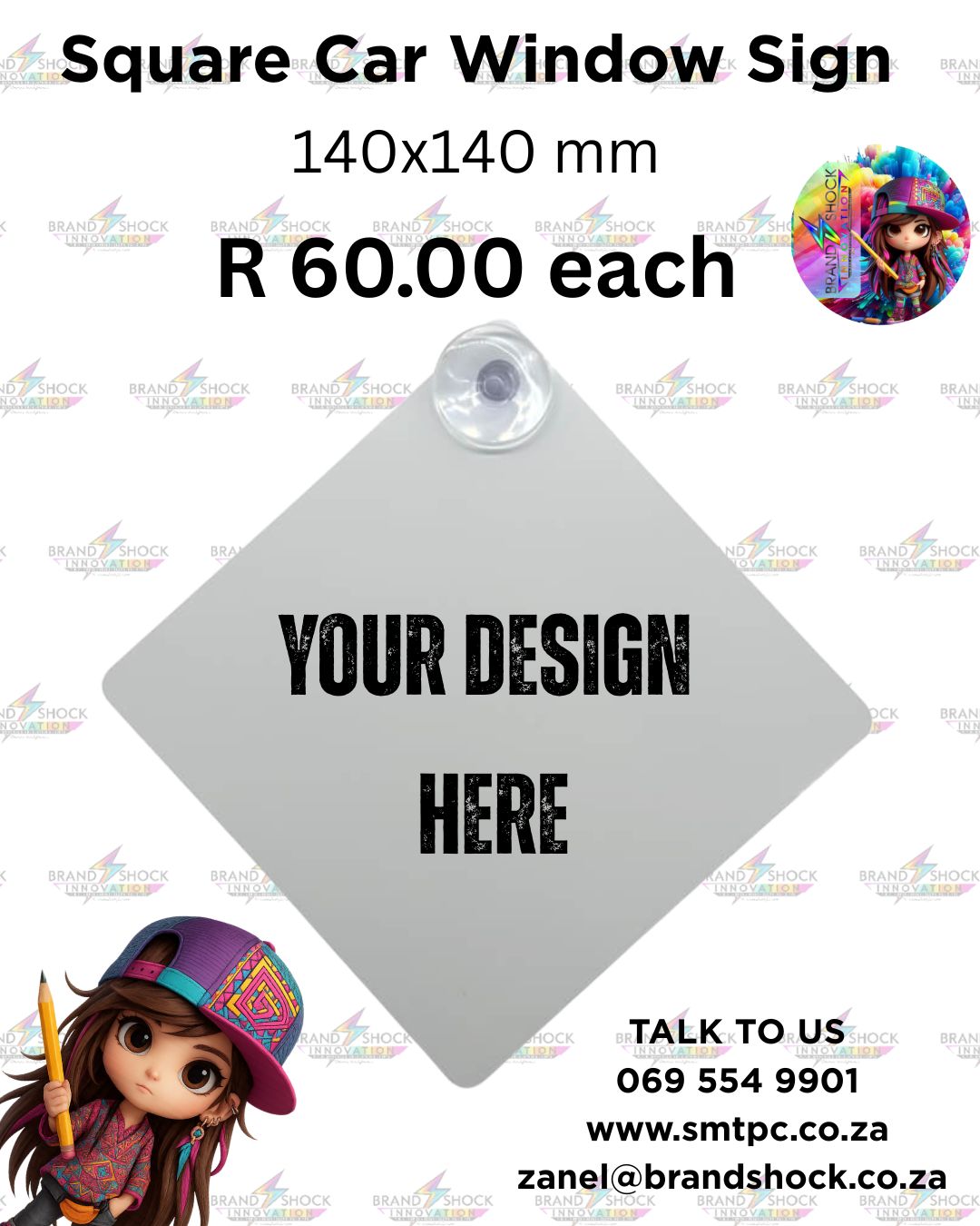 Make a statement on the road with a personalised car window sign – perfect for promoting your business, brand, or personal flair! Our high-quality 140×140 mm square car signs come with a suction cup for easy application and removal, making them ideal for marketing, safety notices (e.g., Baby on Board), or custom designs.